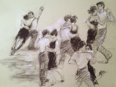 I've been away on a late summer visit and have missed blogging, but am back at Hackberry Street Studio and drawing and painting like mad! Here's a 16 x 20" charcoal drawing with touches of white - kind of a doodle while exploring different tango poses and steps. Although, owing to my great - not!!! - skills as a photographer, it looks like a gray background, it's really a light green - one of the Canson Mi-Teintes boards that are just wonderful. Thanks so much for stopping by! Sold
