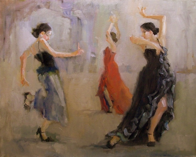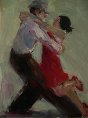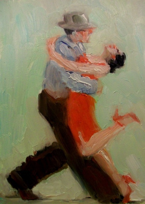 The second of my series of three 14 x 11" tango paintings that I've done recently. They will be available at Artworks in Austin, Texas. No matter what else I may paint, I always come back to tango - just the beautiful way the dancers move in unison. The steps are gorgeous in themselves: He knows his part and she knows hers and they work beautifully together.