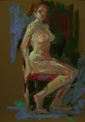 I've sort of been away from my blog - wasting time doing paintings that didn't really succeed. But you have to try, right? Today it was so cold - okay, I know you folks up north think we're a bunch of sissies, but 15 degrees? That's cold for this part of the country! After I went to my Zumba class this morning, I came back home and then started to my studio, but it was still absolutely freezing. I just did a U-turn and walked right back to the house. So no oil paintings today. This oil pastel is from a drawing group in November. I loved the model's hair - it was expressive, if hair can be expressive. Although it wasn't a particularly remarkable pose, she was a good model and I really loved doing this drawing. I drew it on Sennelier Carte d'Art paper and is about 8 x 8".Check out my blog at The Oil Pastel Review for an oil pastel painting that I'm working on - without a lot of success, I might add. Thanks for stopping by - stay warm!