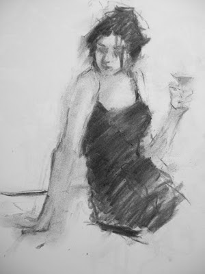 Really good model with a moody look to her and great at holding a difficult pose with shoulder forward, leaning on her arm. Maybe a painting in this - I don't know. It's always just fun to draw, whether the drawings become paintings or not. Drawings are my absolute favorite art thing! This one is vine charcoal on Strathmore drawing paper, 14 x 11" - thanks for looking!