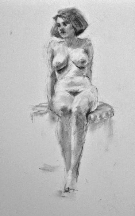 I was very fortunate to have some wonderful company for the past week or so and they just happened to be terrific models, so I have lots of drawings from which to make paintings. Maybe my enthusiasm for the drawings will carry over into making the paintings. For me, drawings are so immediate and don't even require me to think - just react to the model. It's absolute heaven! I did one painting from life, last week, that turned out really well, but the other one was a failure. Except for the nose. The nose was pretty good, so I wiped off everything but the nose. This drawing was done with really soft vine charcoal on cream Strathmore drawing paper and is about 10 x 8". Thanks so much for stopping by!