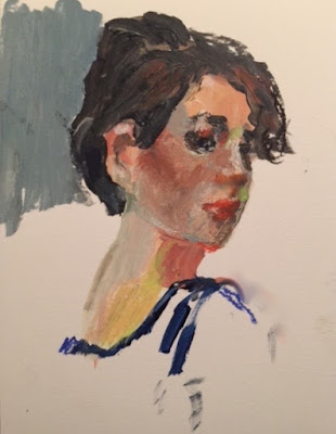 I've been using acrylic paint (again) and found it to be so great to use. Best of all is the drying time - and for me, a looseness that doesn't happen when I use oil. As for the model, I didn't write her name on the back of the panel as I usually do, but it was Janice, I'm pretty sure. And warm colors - I almost never paint anything with such warm colors - don't really know what came over me - I don't think the background was particularly warm, but such a departure from my usual work. It's painted on 8 x 10" gessoed panel. Thanks for looking!