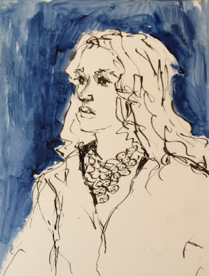 This sketch is a bit brighter in real life, but alas, my photography. On this one, I used blue watercolor sticks with touches of black on 8 x 6" mixed media paper. The model has a tattoo that I didn't have time to show, so I just indicated it with a couple of lines. When I draw a bigger version, though, I intend to include it. Thanks so much for visiting my blog!