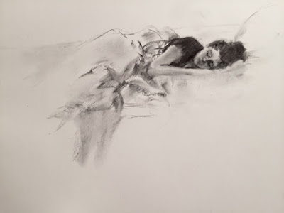 I dunno - seems a little darker than I usually do - the lines, I mean, but variety is the spice. There is some restating here - her leg, which I decided was incorrect, is not in the place where I first put it and her right arm - a similar situation. Oh well - that's what figure drawing is all about. And the T principle - from Jack Hamm - is ambiguous on her left arm, but that's what I saw and I'm sticking to it. On 12 x 9" drawing paper. Thanks for looking!