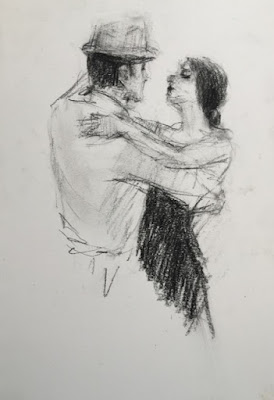 Here's a charcoal sketch from my sketchbook - I love it when I actually get to draw people dancing. It always ends up being a memory drawing, though, because they always move on very quickly - which is the exciting thing about dancing! I have so many sketchbooks, but my favorite is a spiral-bound one - not pretty with a charming cover as so many are - but I love it and just bought more. If they're not fun to draw in, what's the point? Thanks for stopping by!